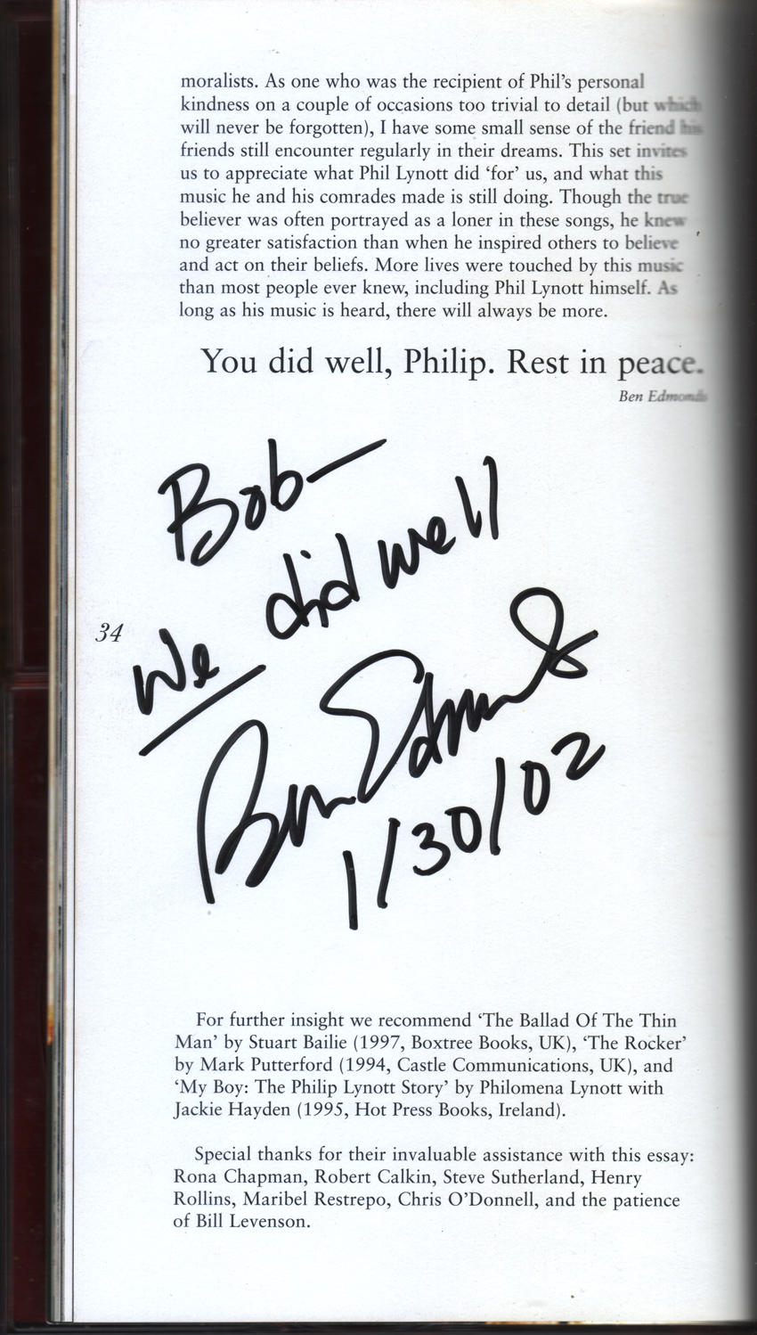 I picked up Ben Edmonds at the airport on January 30, 2002 (the guy that wrote the liner notes for Vagabonds, Kings, Warriors, Angels--the new Thin Lizzy 4 CD box set which I helped him do the research for). He said that the box set's notes were supposed to be twice as long with testimonials from everyone who knew Philip, but they cut them all out. Write to the record company and tell them to put them in the next printing as they haven't released it in America yet...(Thanks Ben for putting my name in there--one of the best feelings in the world is when you can pay some kind of homage to your personal hero and I think I have done that time and again for good old Phil...he was truly one of a kind. I think about him everyday...!